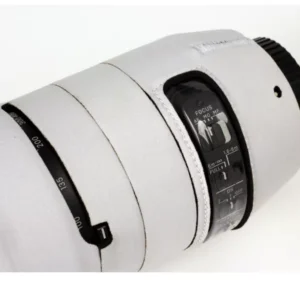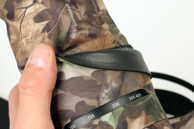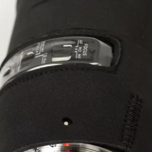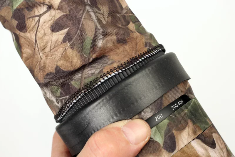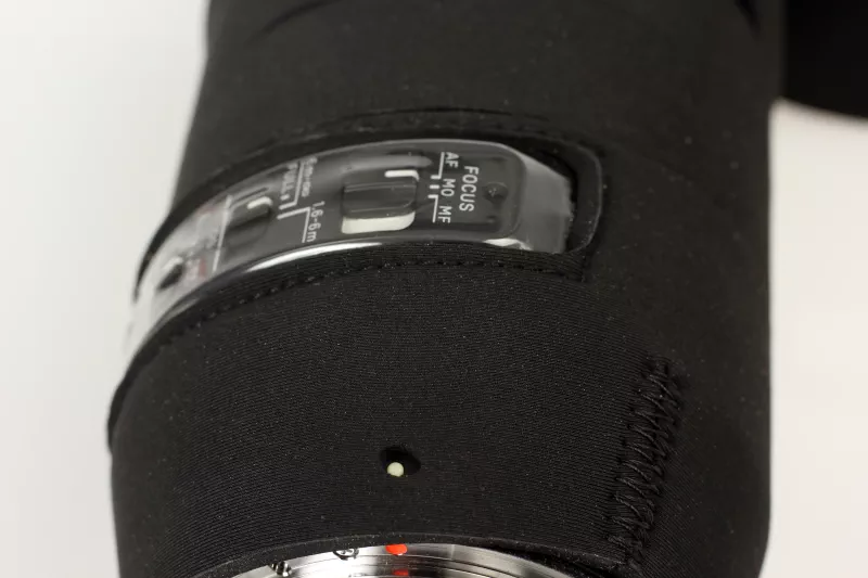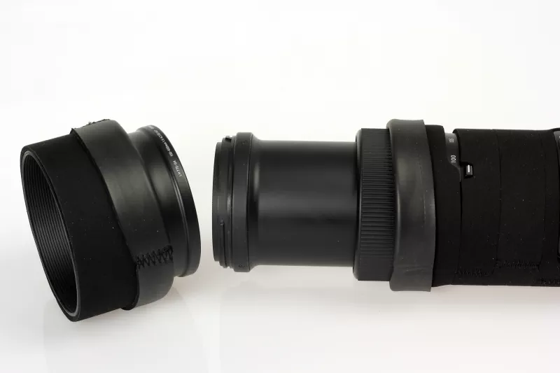 The last step is the elastic zoom sleeve: insert it under the edge of the neoprene on the zoom ring and lens hood, leaving an overlap of about 2–3 cm. This creates a clean, protected transition that moves smoothly with your zooming.